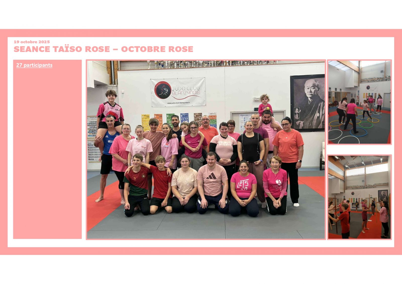 Une belle activité ce dimanche matin sur les tatamis du Dojo de la Verrerie, pour une séance de Taïso solidaire dirigée par Arnaud avec une trentaine de participants, Petit déjeuné et verre de l’amitié offert par le club sont venus encadrer cette matinée conviviale et familiale .